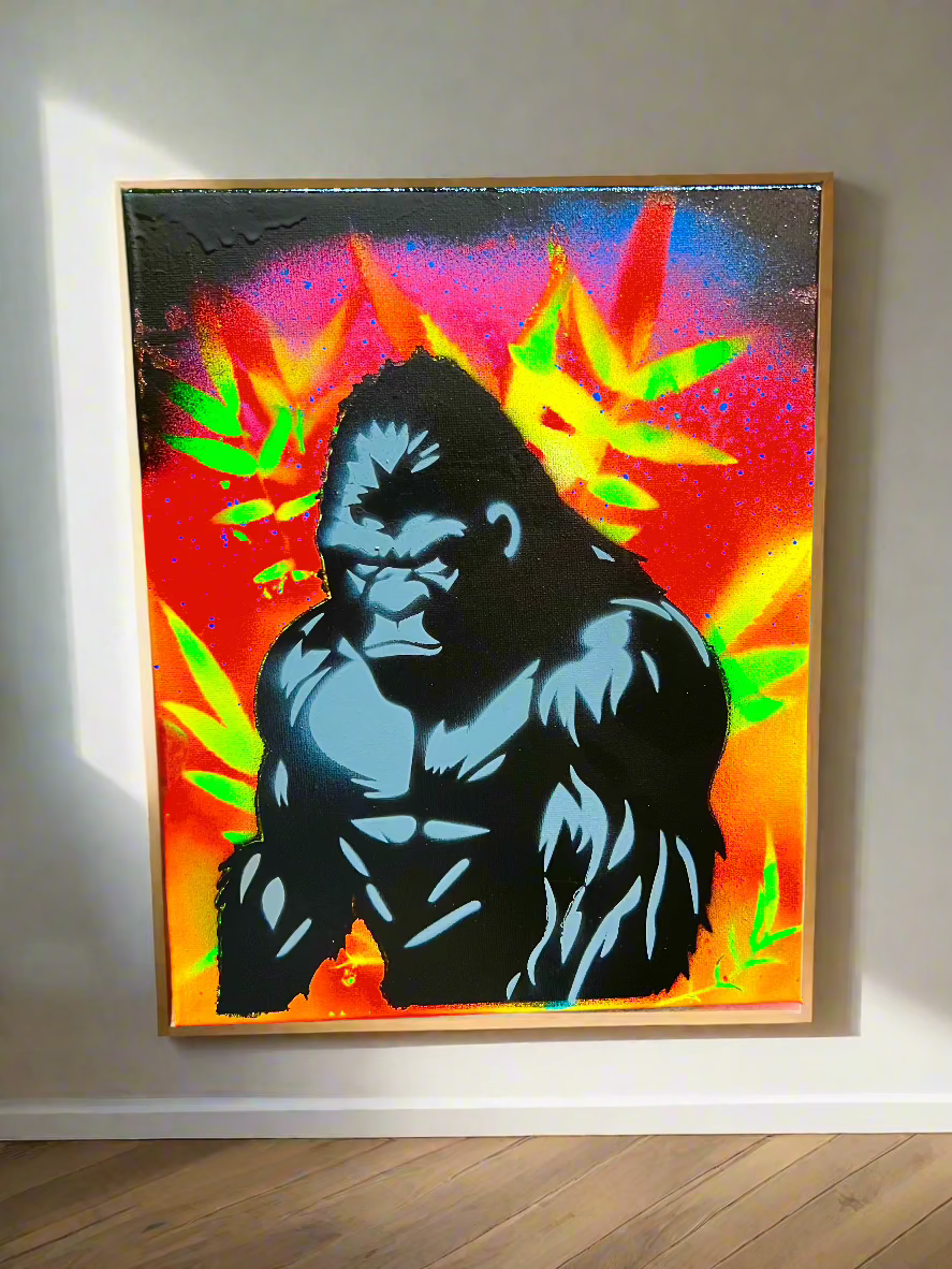 This expertly-sprayed gorilla portrait is a stunning addition to any space. The vibrant UV colors used in this unique piece bring the jungle to life, creating a bold and captivating display. Elevate your décor with this truly one-of-a-kind painting.